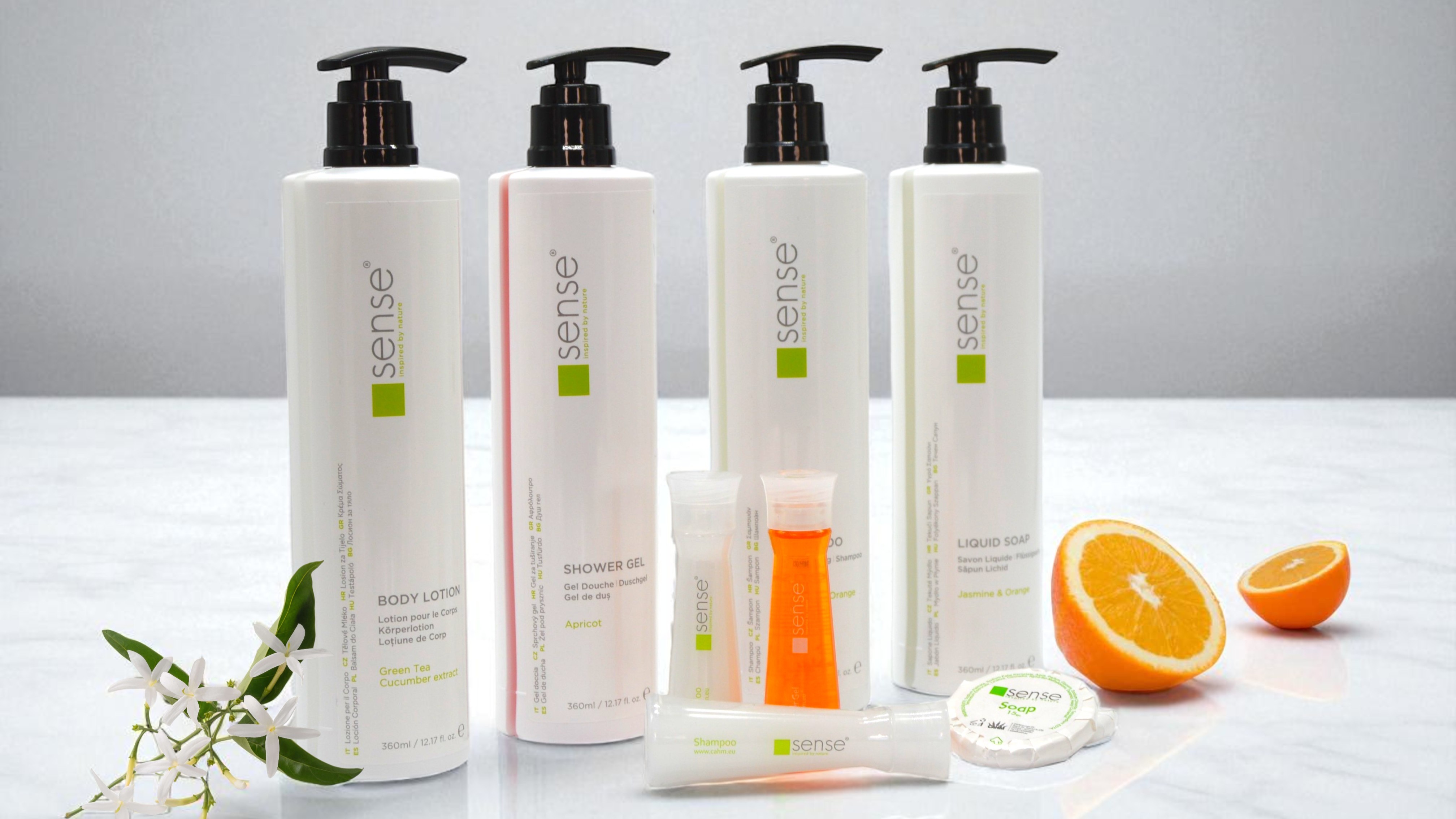 SENSE è una linea cosmetica per hotel ispirata alla natura. Una linea classica di cosmetici per hotel che coniuga perfettamente freschezza, eleganza e semplicità. Pulizia, delicata cura della pelle, fresche note di gelsomino, arancia e pesca.