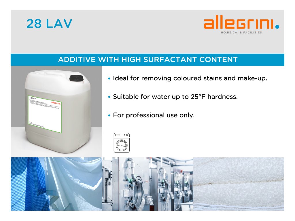Indispensabile per macchie ostinate e trucco (rossetto, lucidalabbra, crema solare). In combinazione con detersivi e booster alcalini (21 LAV - 22 LAV), l'effetto lavante è moltiplicato.