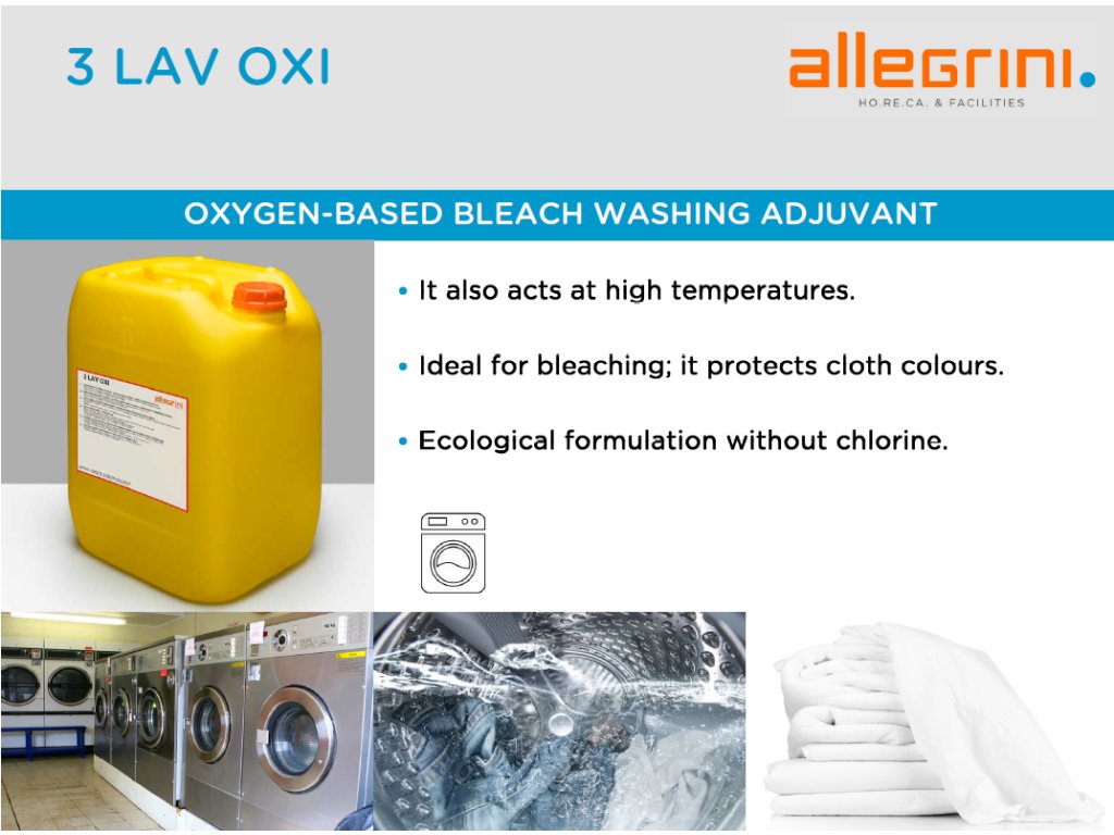 Grazie alla sua composizione ecologica senza cloro, 3 LAV OXI è ideale per rimuovere tutte le macchie sia su fibre che su colori. Si utilizza durante il lavaggio come integratore ai detersivi tradizionali, anche ad alte temperature.