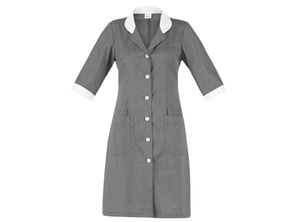 L'abito da cameriera Ortensia è realizzato in leggero policotone mélange del peso di soli 113 g/m². Ha un taglio Slim Fit, una patta centrale con sei bottoni opachi, colletto e polsini bianchi e due tasche arrotondate. Il tessuto è resistente alle alte temperature.