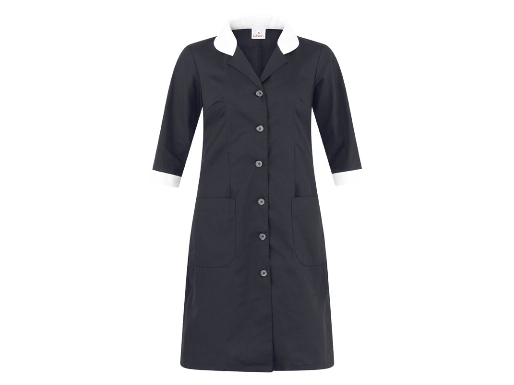 L'abito da cameriera Ortensia è realizzato in leggero policotone mélange del peso di soli 113 g/m². Ha un taglio Slim Fit, una patta centrale con sei bottoni opachi, colletto e polsini bianchi e due tasche arrotondate. Il tessuto è resistente alle alte temperature.
