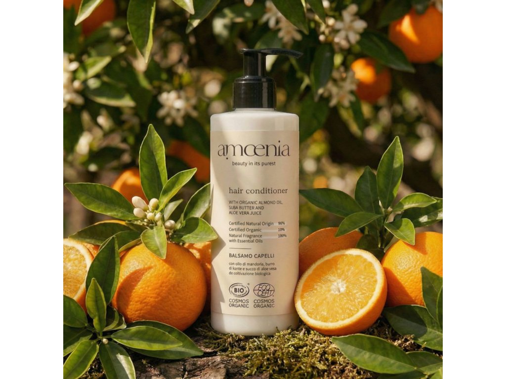 Balsamo AMOENIA 300 ml con erogatore a pompa, arricchito con ingredienti biologici come olio di mandorle, burro di karité e succo di aloe vera, idratano, rigenerano e lasciano i capelli morbidi e districati. Ideale per lavaggi frequenti.