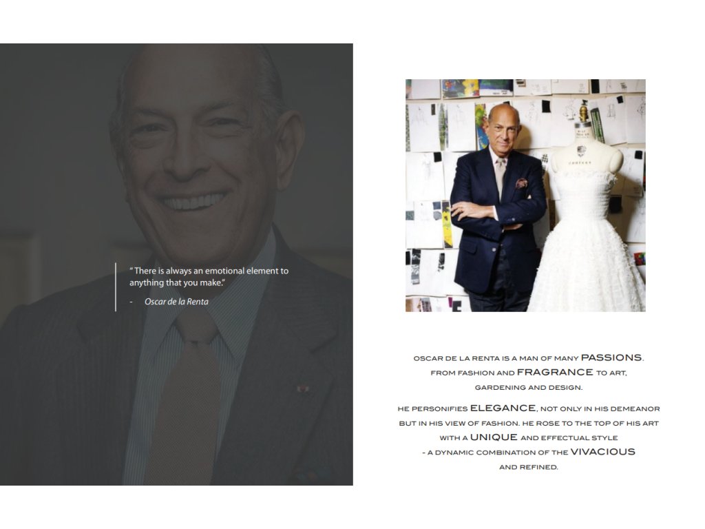 OSCAR DE LA RENTA è una casa di moda con sede a New York fondata nel 1965. De la Renta veste celebrità in tutto il mondo da decenni. Si è distinto per la qualità dei suoi abiti, rendendoli sinonimo di successo e vita lussuosa.