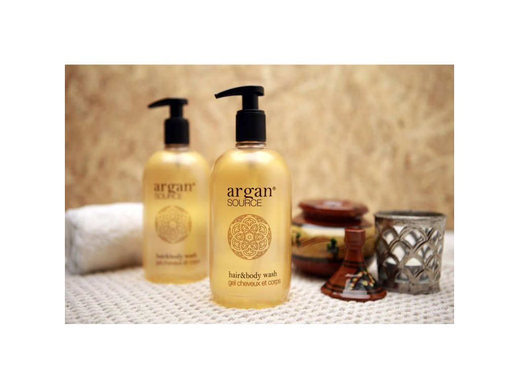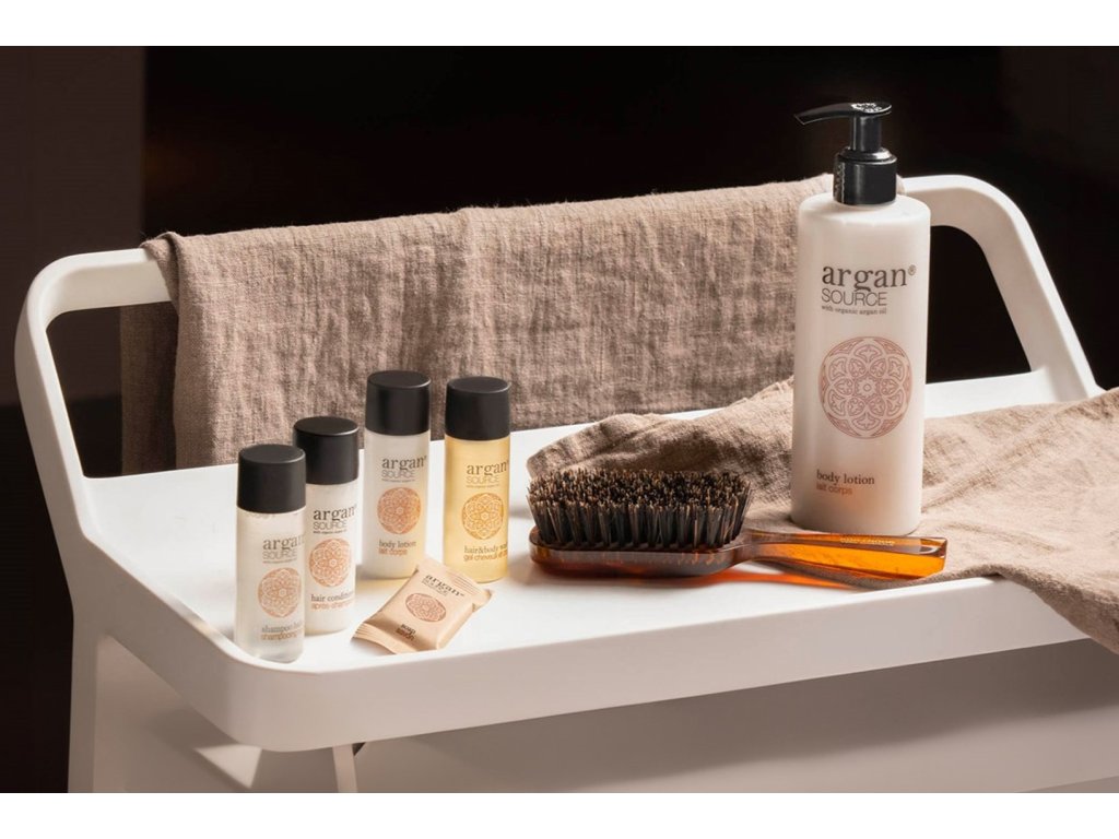 Cosmetici per hotel ARGAN SOURCE, a base di olio di argan biologico. Un elisir di bellezza diventato un must nella cosmesi grazie ai suoi antiossidanti. Svolge inoltre un'azione emolliente e idratante. L'incantevole fragranza e l'elegante finitura satinata trasporteranno i vostri ospiti nell'atmosfera del Marocco. Qualità sofisticata ispirata all'oro del deserto.