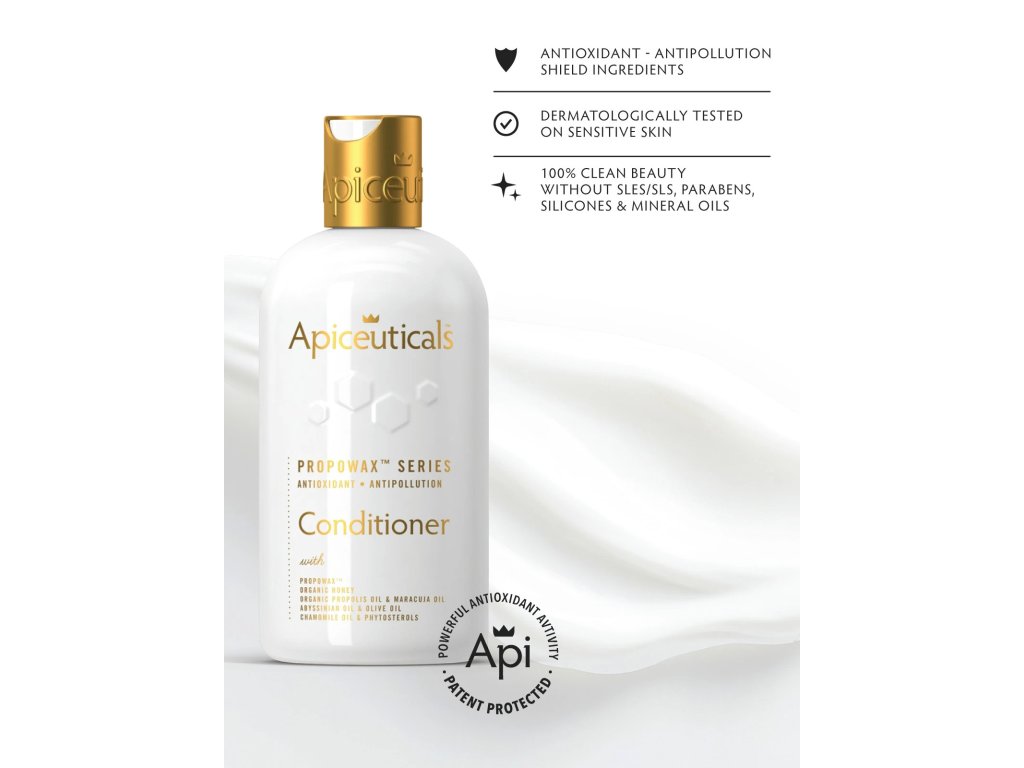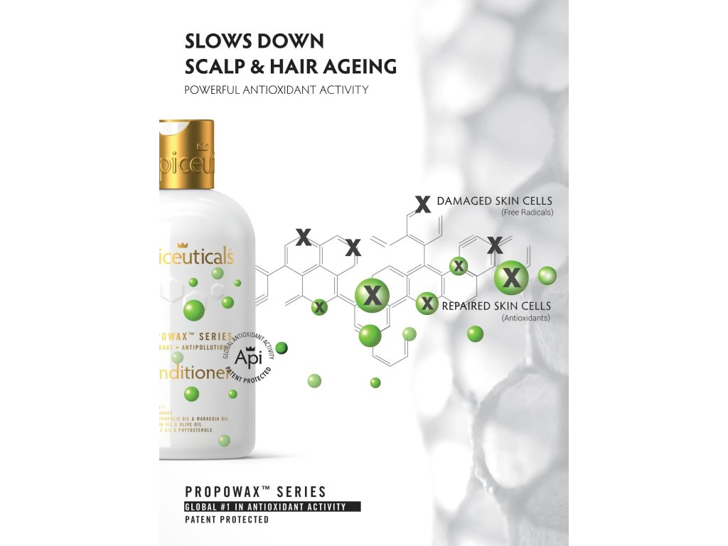 Il Balsamo Antiossidante PROPOWAX™ nutre, districa e ristruttura i capelli, lenendo il cuoio capelluto. Dotato della tecnologia brevettata Living Honeycomb, che ha dimostrato di fornire la più alta attività antiossidante al mondo, questa formula protegge dallo stress ossidativo, idratando e levigando le doppie punte. Lascia i capelli setosi, senza crespo e avvolti dall'esclusiva e lussuosa fragranza Apiceuticals.