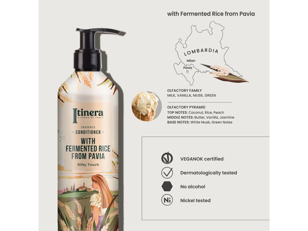 Balsamo 'Silky Touch' con riso fermentato di Pavia per una morbidezza perfetta. Ingredienti di origine naturale, accuratamente selezionati per la loro efficacia, al minimo il 95%.
