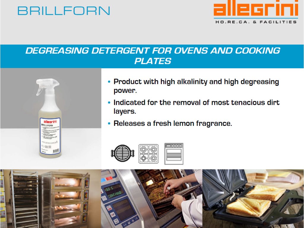 USO: BRILLFORN è Detergente altamente efficace per la pulizia e lo sgrassaggio di piani cottura, forni, fiamme, tostapane e scaldapanini. Particolarmente indicato per rimuovere vecchi strati di grasso secco, residui carbonizzati, unto e sporco, anche in quantità significative. BRILLFORN è un prodotto fortemente alcalino contenente tensioattivi anionici e anfoteri ad alto potere sgrassante e un forte effetto bagnante in grado di potenziare l'azione degli alcali. Il fresco profumo di limone rende il prodotto piacevole da usare. Ideale per sale da pranzo, hotel, ristoranti, fast food, pasticcerie, ecc..