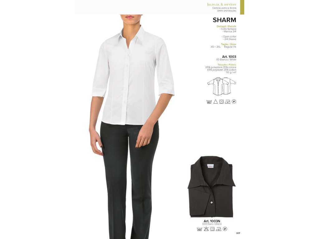 Camicia da donna con maniche a 3/4 e scollo fantasia, semiaderente, disponibile in varie taglie e colori. Design made in Italy.