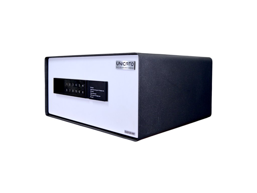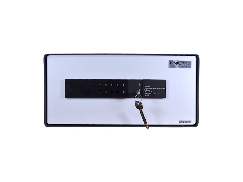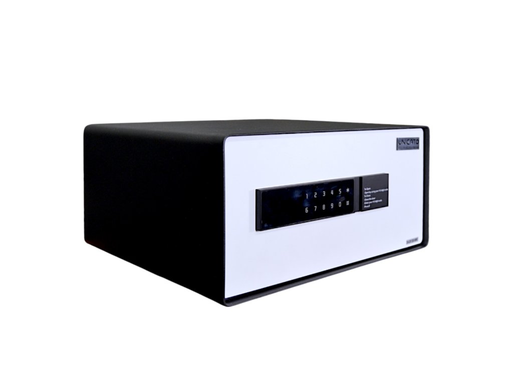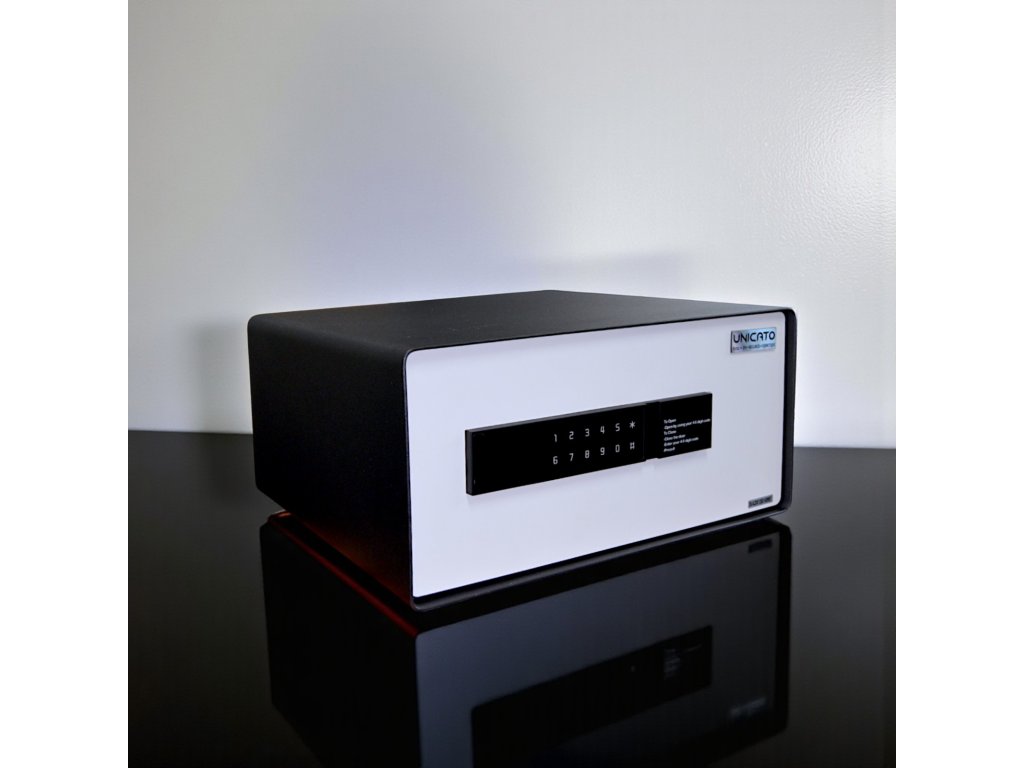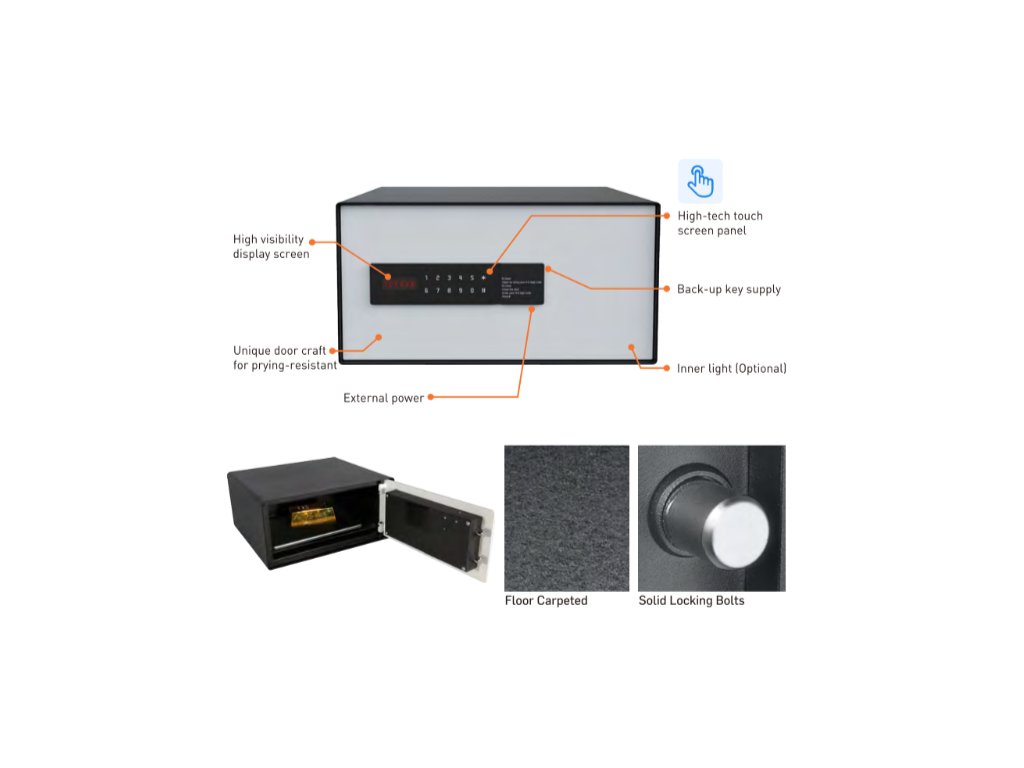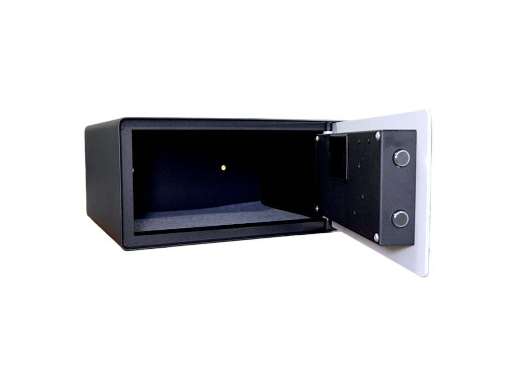 Cassaforte per hotel HEKA modello 4601 - una cassaforte dal design molto moderno e dotata di touch screen. Le sue dimensioni spaziose la rendono ideale per custodire oggetti di valore multipli come denaro, gioielli, laptop ed elettronica. Il suo esclusivo design dello sportello la rende resistente ai tentativi di scasso, così i tuoi oggetti saranno sempre al sicuro. Il moderno design in bianco e nero si adatta a qualsiasi interno.