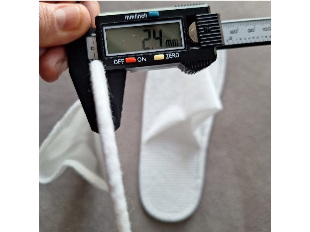 Ciabatte da hotel realizzate in cotone 100% naturale su ponte e soletta, suola in carta indurita. Le ciabatte sono biodegradabili al 100% in natura e prive di plastica al 100%. Non hanno la stessa resistenza in ambienti umidi di una classica suola in plastica, quindi NON sono consigliate per l'uso in piscina.