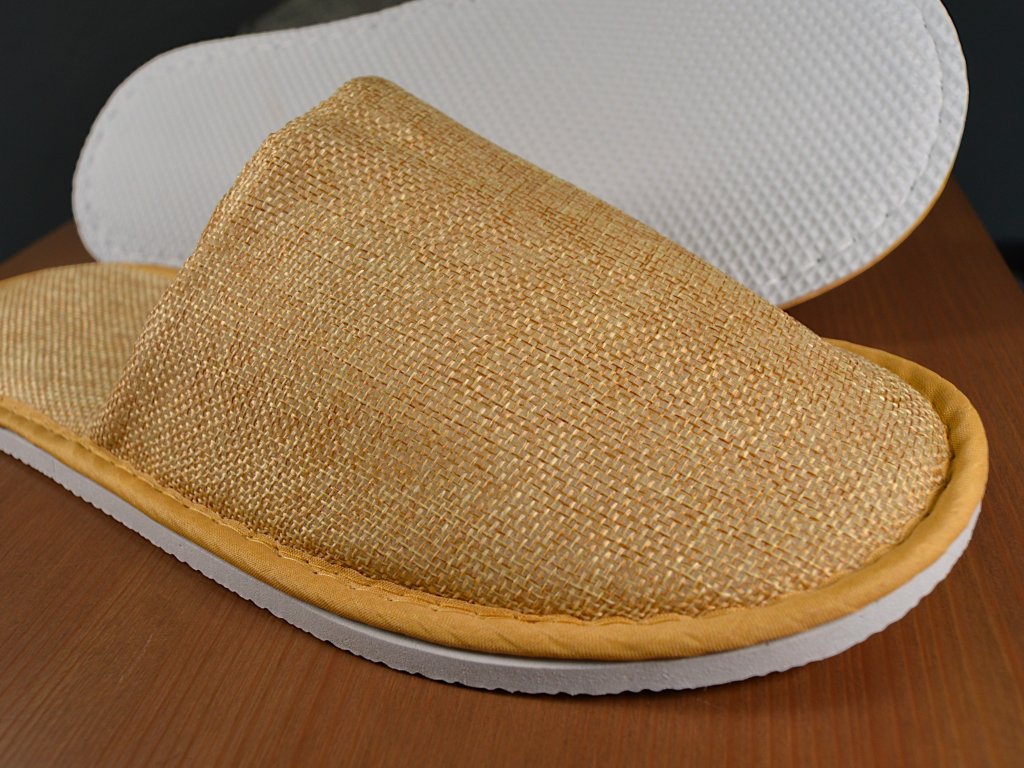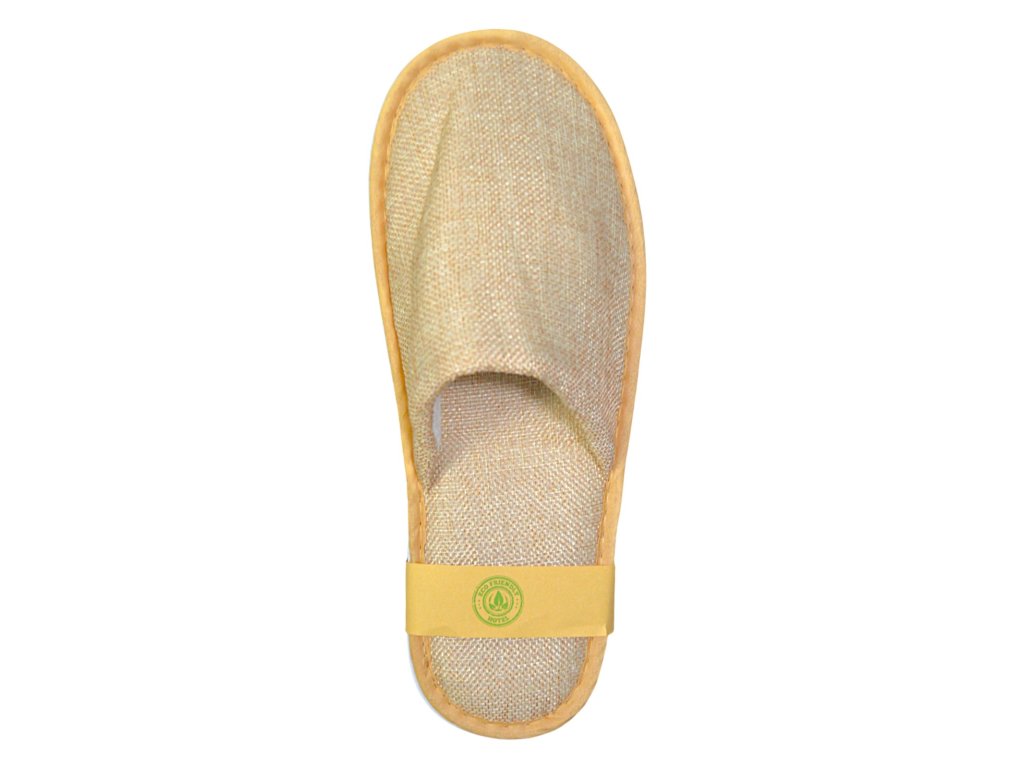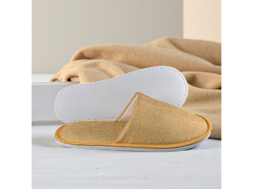 Queste pantofole beige in cotone e lino hanno una soletta in EVA spessa 6 mm, adatta a tutti i tipi di pavimento. L'imbottitura extra sul tallone garantisce una camminata confortevole. Sono disponibili nella misura standard di 29,5 cm, ma possono essere completamente personalizzate con un logo ricamato. Vengono consegnate in una scatola da 200 pezzi, ogni paio è separato da una striscia di carta ECO FRIENDLY HOTEL, che riduce l'impatto ambientale dovuto ai rifiuti di plastica.