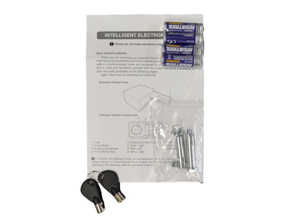 La confezione della cassaforte include batterie AA, 2 chiavi di servizio, viti di installazione e istruzioni per l'uso.