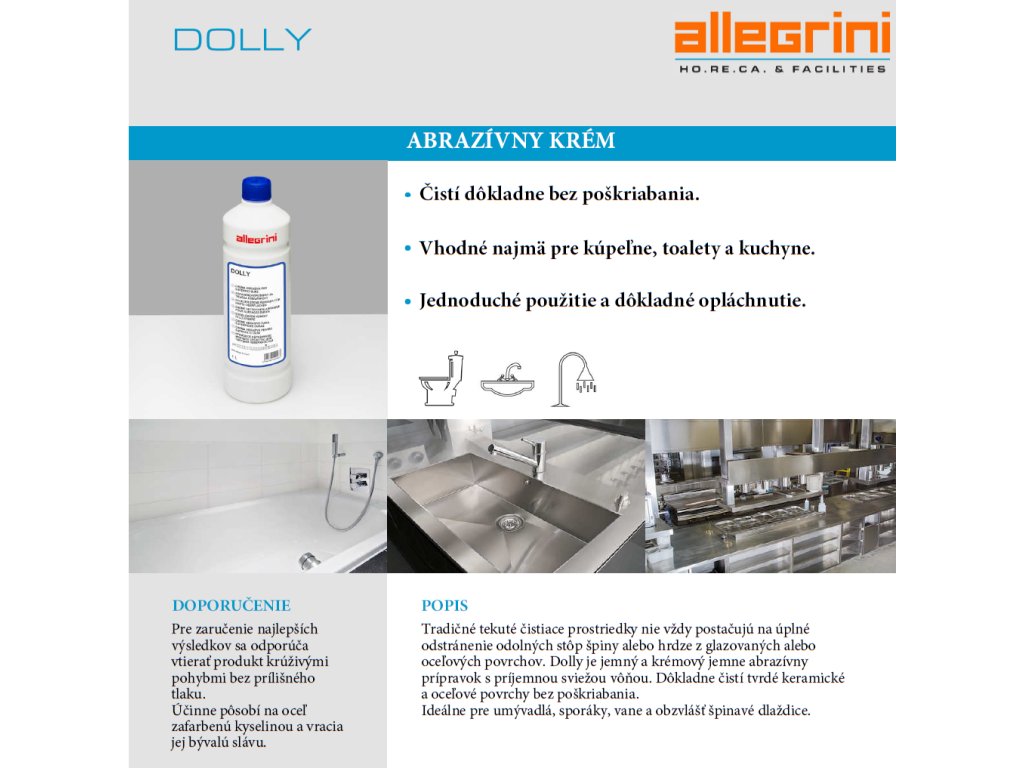 I detergenti liquidi tradizionali non sono sempre sufficienti a rimuovere completamente lo sporco ostinato o la ruggine dalle superfici smaltate o in acciaio. Dolly è un abrasivo delicato e cremoso, dal profumo fresco e gradevole. Pulisce a fondo le superfici dure in ceramica e acciaio senza graffiare. Ideale per lavelli, fornelli, vasche da bagno e piastrelle particolarmente sporche.