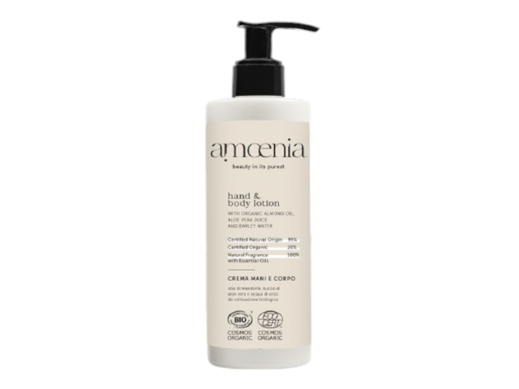 La crema corpo AMOENIA da 300 ml con erogatore a pompa è arricchita con Ingredienti provenienti da agricoltura biologica, come olio di mandorle, succo di aloe vera e acqua d'orzo, per una pelle nutrita, vellutata e profumata. La sua delicata profumazione 100% naturale è un'armonia di preziosi oli essenziali, che avvolge i sensi nell'abbraccio della natura pura.