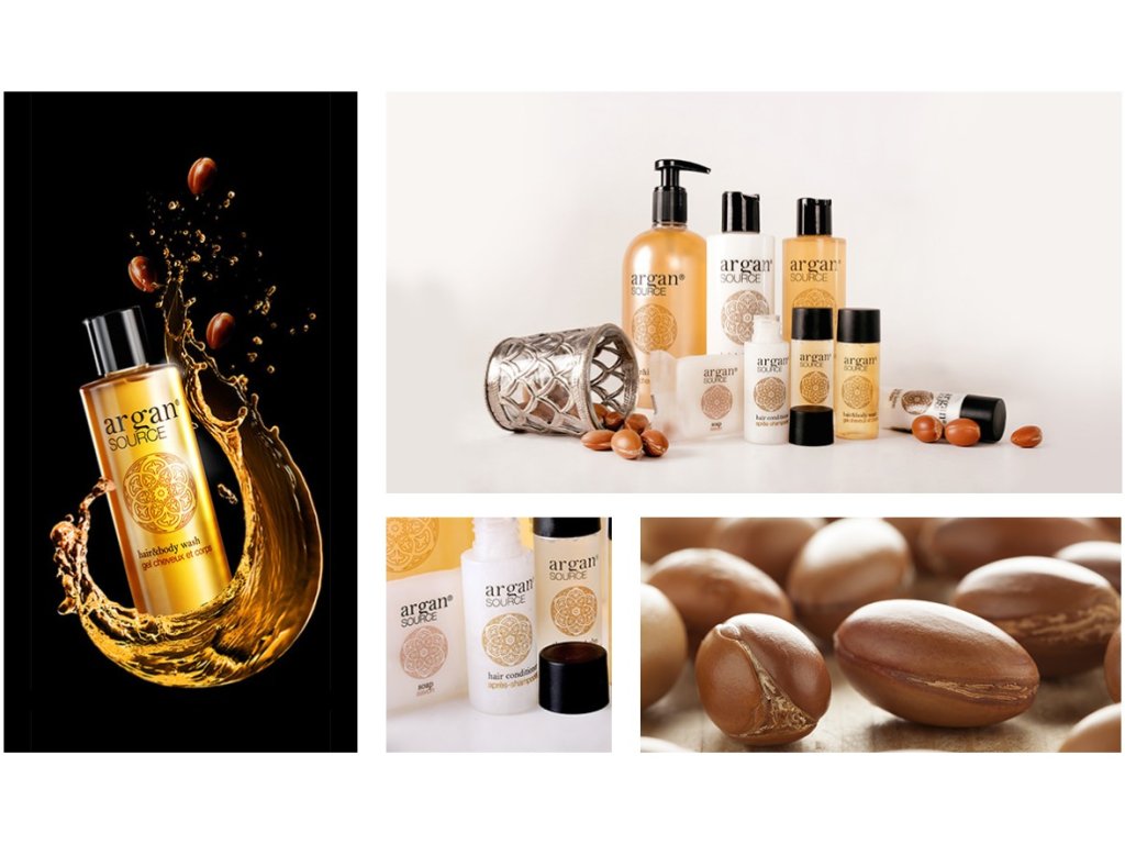 Cosmetici per hotel ARGAN SOURCE, a base di olio di argan biologico. Un elisir di bellezza diventato un must della cosmesi grazie ai suoi antiossidanti. Ha anche effetti emollienti e idratanti. Il profumo incantevole e l'elegante finitura satinata trasporteranno i vostri ospiti nell'atmosfera del Marocco. Qualità sofisticata ispirata all'oro del deserto.