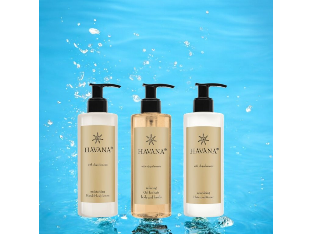 HAVANA: cosmetici per hotel ispirati alla talassoterapia. Havana, con la sua profumazione rinfrescante e salutare ispirata alla talassoterapia, è composta da prodotti per combattere stress e stanchezza. Tutti i benefici della terapia, che risale a tempi antichi, sono racchiusi in un concentrato di oligoelementi, altamente idratanti e rimineralizzanti. La sua particolare profumazione evoca ricordi coloniali, rendendo Havana una linea meravigliosa dai richiami esotici.