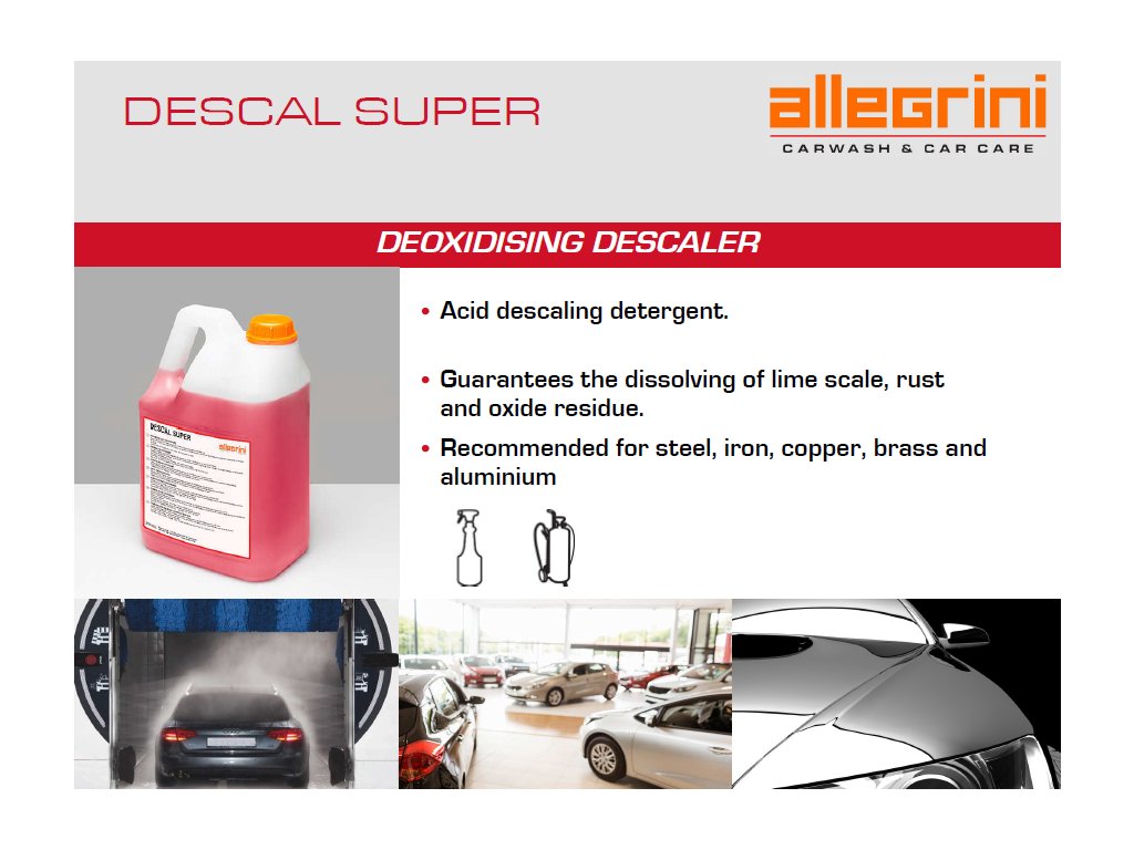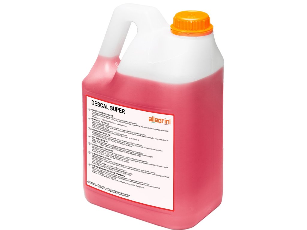 DESCAL SUPER è un prodotto specifico studiato per sciogliere e rimuovere residui inorganici quali ossidi, incrostazioni, calcare, ruggine dalle superfici di impianti industriali e attrezzature dell'industria alimentare. Permette la rimozione di materiali come acciaio, ferro, rame, ottone e alluminio. Oltre alla sua capacità disincrostante, DESCAL SUPER ha anche la capacità di sgrassare la superficie, rimuovendo i residui grassi che impedirebbero la disincrostazione. Può essere utilizzato in diverse aziende di produzione per rimuovere il calcare: tubazioni, caldaie, evaporatori, scambiatori di calore, radiatori, scaldabagni, sistemi di raffreddamento, centrali elettriche, idropulitrici, ecc. È anche molto efficace sullo sporco ostinato nelle fughe di piastrelle e pavimentazioni.