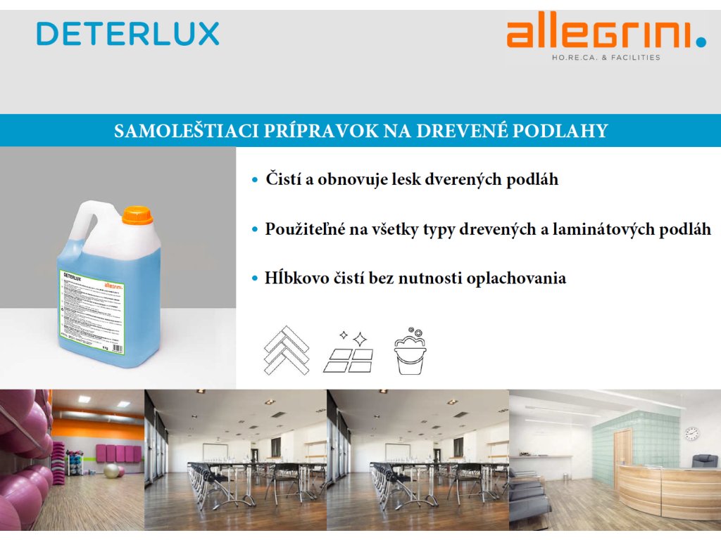 Molte attività, commerciali e non, richiedono la pulizia quotidiana dei pavimenti. Per questo motivo, è necessaria una soluzione valida in grado di garantire la massima efficienza e praticità, ottimizzando i tempi per la pulizia quotidiana. DETERLUX è un agente autolucidante per il trattamento e la manutenzione di pavimenti in gres porcellanato, marmo trattato a piombo e parquet. Viene utilizzato su pavimenti pretrattati con cere acriliche, preservandone la lucentezza originale.