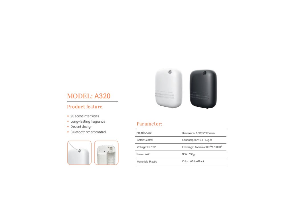 Abbiamo migliorato notevolmente la struttura di atomizzazione, migliorando notevolmente le prestazioni silenziose del dispositivo. La ventola integrata ad alta velocità funziona con un potente motore da 6000 giri/min per diffondere la fragranza, mantenendo al contempo il rumore di funzionamento a un livello estremamente basso di 43 dB, simile a quello prodotto quando si girano delicatamente le pagine, praticamente silenzioso. Che sia in ufficio, in studio o in camera da letto, l'A320 può creare silenziosamente un'atmosfera aromatica calma e piacevole senza disturbare.