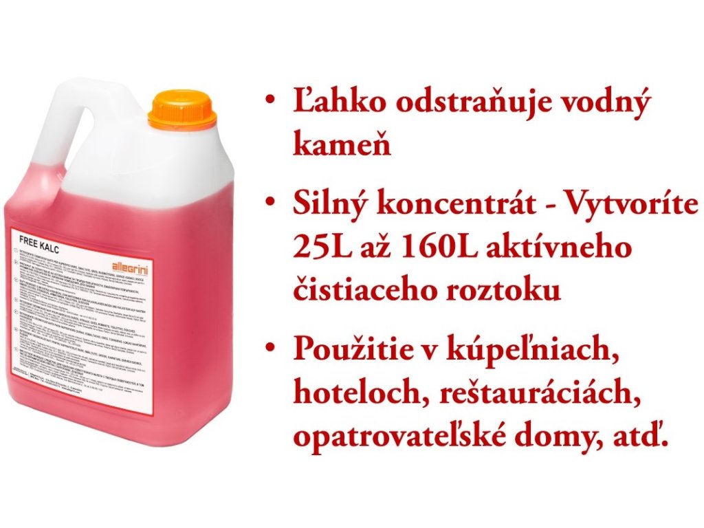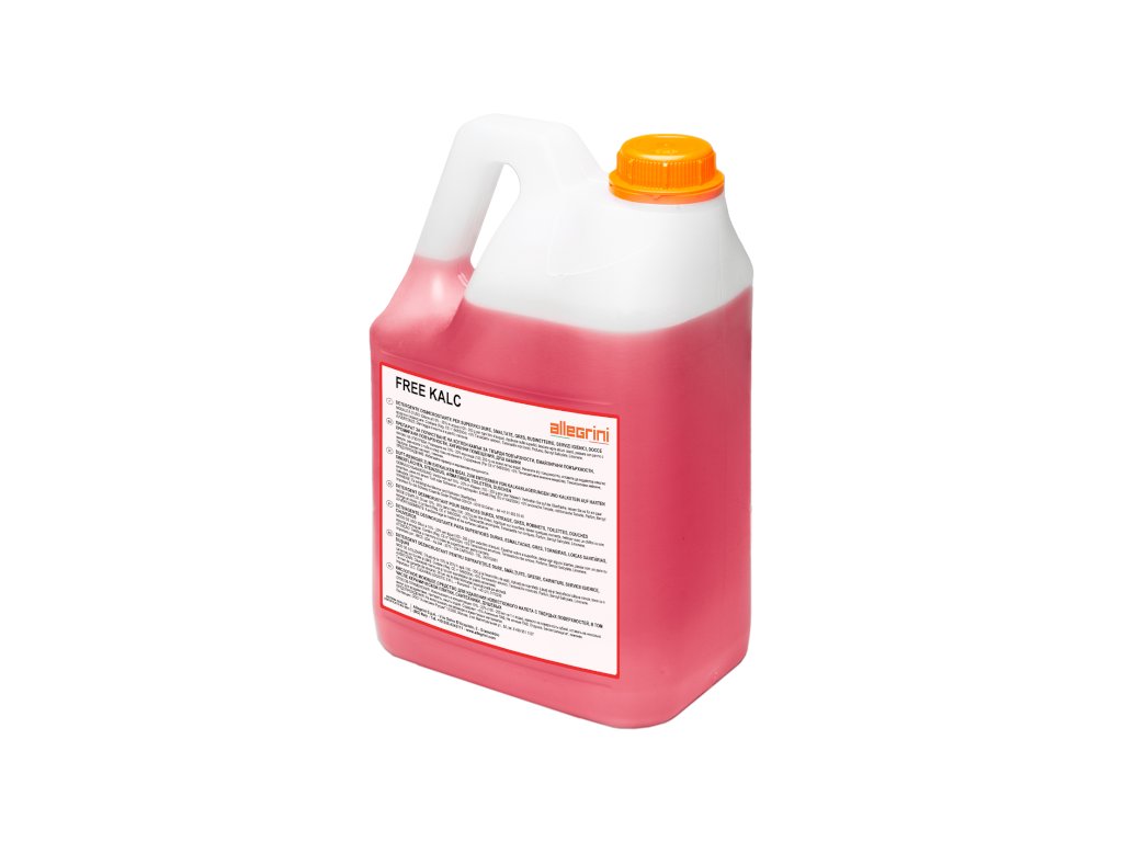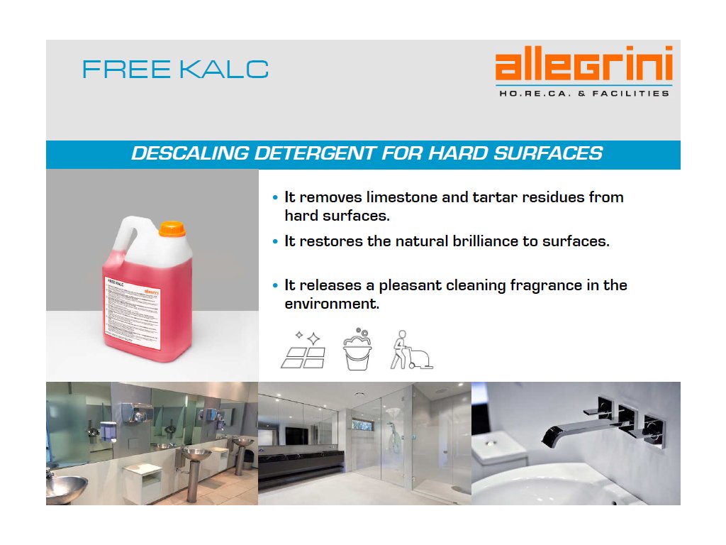 USO: Gli ambienti dei bagni degli hotel, degli edifici pubblici e degli spazi in generale, a causa del contatto costante con l'acqua, sono esposti a depositi di calcare costanti. FREE KALC è un concentrato profumato per la rimozione di calcare e sporco residuo da superfici di bagni, WC, docce, superfici dure, verniciate e in gres.