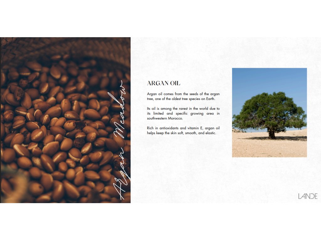 OLIO DI ARGAN - proviene dai semi dell'albero di argan, una delle specie arboree più antiche della Terra. Il suo olio è tra i più rari al mondo a causa della sua limitata e specifica area di coltivazione nel sud-ovest del Marocco. L'olio di argan, ricco di antiossidanti e vitamina E, aiuta a mantenere la pelle morbida, liscia ed elastica.
