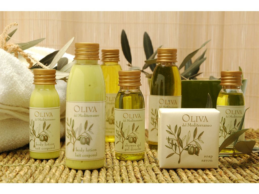 "Oliva del Mediterraneo" è un marchio di cosmetici per hotel che utilizza olio d'oliva biologico e si basa su antichi segreti di bellezza italiani. I prodotti sono studiati per detergere e idratare delicatamente pelle e capelli e sono noti per la loro fresca fragranza mediterranea, che combina note di bergamotto, eucalipto, fiori d'arancio, timo, ylang-ylang e altro ancora.