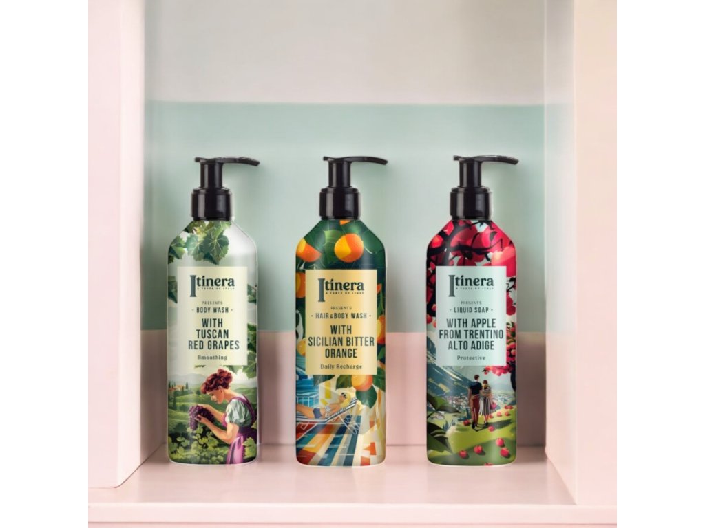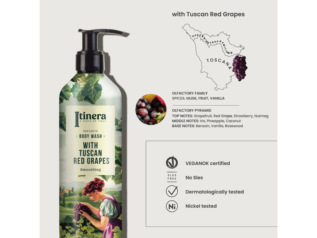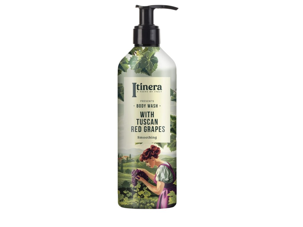 Dai vigneti delle colline toscane provengono uve rosse, i cui estratti, insieme a mele del Trentino, limoni della Costiera Amalfitana e crusca di grano della Pianura Padana, note per le loro proprietà emollienti, tonificanti e rigeneranti per la pelle, arricchiscono il bagnoschiuma degli ingredienti necessari.