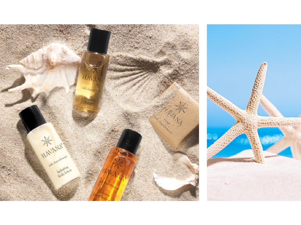HAVANA: cosmetici per hotel ispirati alla talassoterapia. Havana, con la sua profumazione rinfrescante e salutare ispirata alla talassoterapia, è composta da prodotti per combattere stress e stanchezza. Tutti i benefici della terapia, che risale a tempi antichi, sono racchiusi in un concentrato di oligoelementi, altamente idratanti e rimineralizzanti. La sua particolare profumazione evoca ricordi coloniali, rendendo Havana una linea meravigliosa dai richiami esotici.