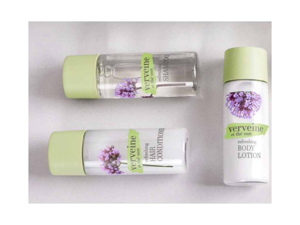 I cosmetici per hotel VERVEINE ET THE VERT al profumo di verbena ed estratto di tè verde sono il perfetto connubio tra energia e vitalità. La verbena, grazie alle sue proprietà aromatiche, regala emozioni uniche e stimolanti alla nostra mente. Un altro ingrediente caratteristico di questa linea è l'estratto di tè verde, noto per le sue proprietà detergenti ed energizzanti. Questa collezione si ispira ai profumi della campagna provenzale, dove crescono campi di verbena di rara bellezza.