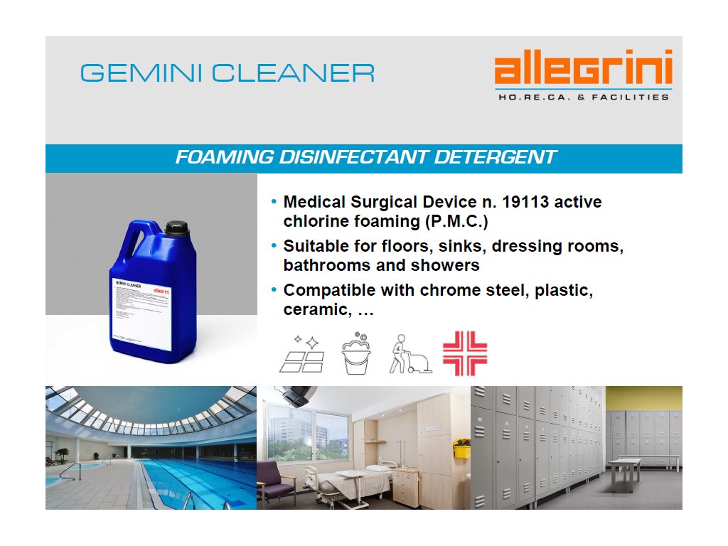 USO: La principale fonte di trasmissione di batteri e virus avviene nei bagni, negli spogliatoi e negli ambulatori. È essenziale garantire l'igiene in ambienti frequentati da numerose persone. GEMINI CLEANER è appositamente studiato per la pulizia e la disinfezione di lavandini, accessori da bagno, pavimenti in piastrelle e linoleum, superfici dure in genere. Se utilizzato quotidianamente, dona all'acciaio un aspetto brillante. L'effetto disinfettante si esplica utilizzando cloro attivo, che elimina batteri, funghi, lieviti e virus. Il prodotto si decompone e previene la formazione di cattivi odori. Se opportunamente diluito, non necessita di risciacquo. Adatto per palestre, hotel, scuole, asili, uffici, piscine, centri benessere, ecc.