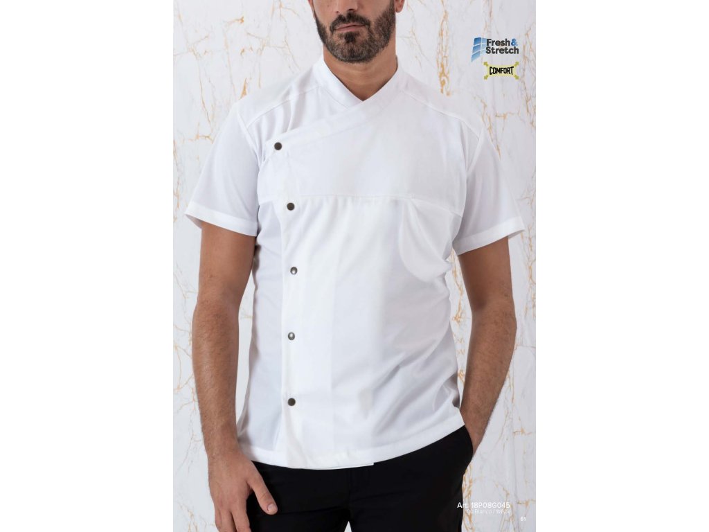 Innovativo rondón a maniche corte realizzato in un mix di LUXSATIN e FRESH&STRETCH: la parte superiore del davanti è realizzata in morbido cotone poliestere, il resto del capo è realizzato in leggerissimo piquet 100% poliestere estremamente traspirante. Comfort, freschezza e libertà di movimento sono garantiti! Con eleganti bottoni automatici in metallo lucido e taschino nascosto sul petto. Facile da stirare.