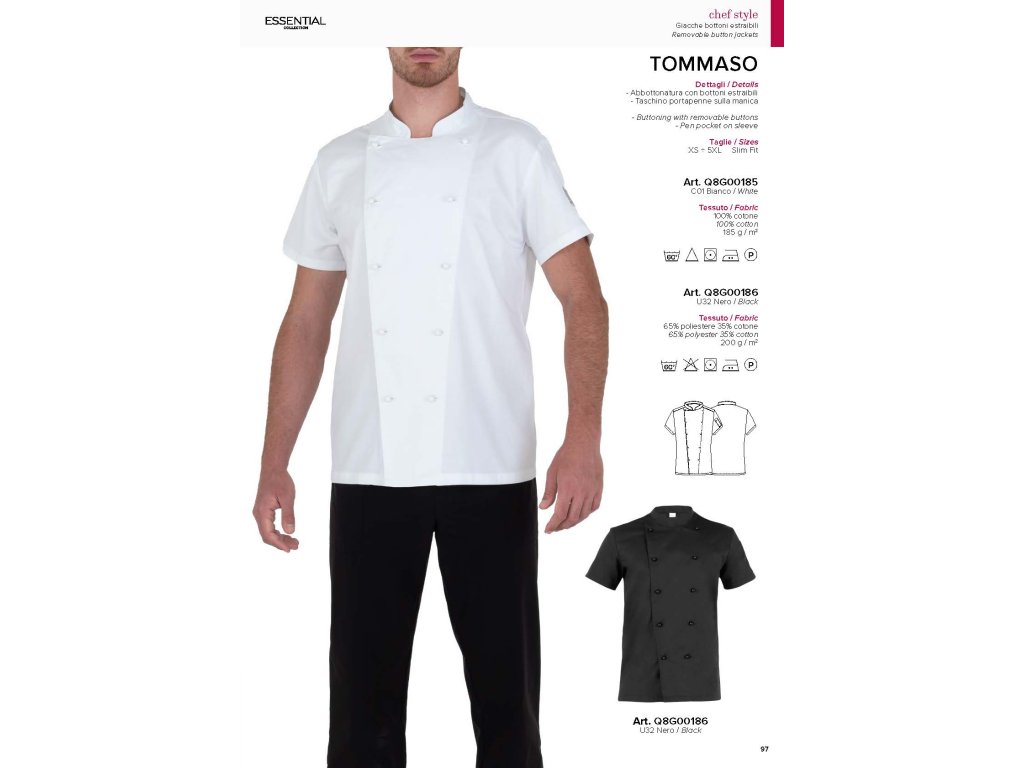 La giacca da cuoco Tommaso a maniche corte presenta una chiusura doppiopetto con bottoni, colletto e polsini arrotondati e un portapenne sulla manica sinistra. Ha una vestibilità slim e bottoni rimovibili.