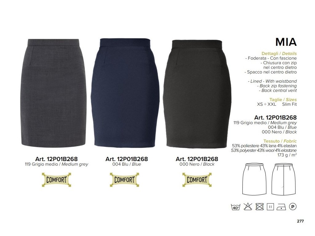 La gonna Mia, con vita regolare e vestibilità slim, offre il perfetto equilibrio tra eleganza e comfort. Realizzata in un mix di 53% poliestere, 43% lana e 4% elastan. La chiusura centrale con zip sul retro e lo spacco garantiscono libertà di movimento. Disponibile in nero, blu e grigio medio.