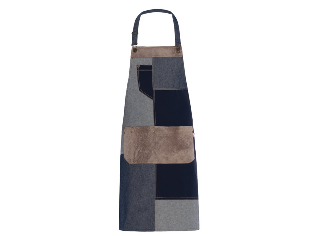Lo stile sorprendente di questi grembiuli in denim patchwork blu, disponibili sia nella versione da uomo che da donna. Il tessuto denim, utilizzato al rovescio, abbinato a inserti e tasche in alcantara, conferisce un look autentico e contemporaneo.