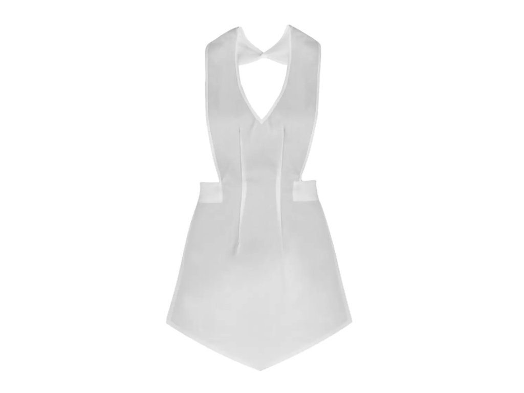 Il grembiule con pettorina Mimosa completa il completo vestaglia Viola e Ortensia, è cucito in un piacevole tessuto di cotone bianco al 100%, rifinito con un motivo a pois sul davanti. Il tessuto è resistente alle alte temperature.