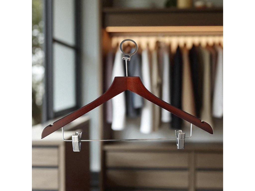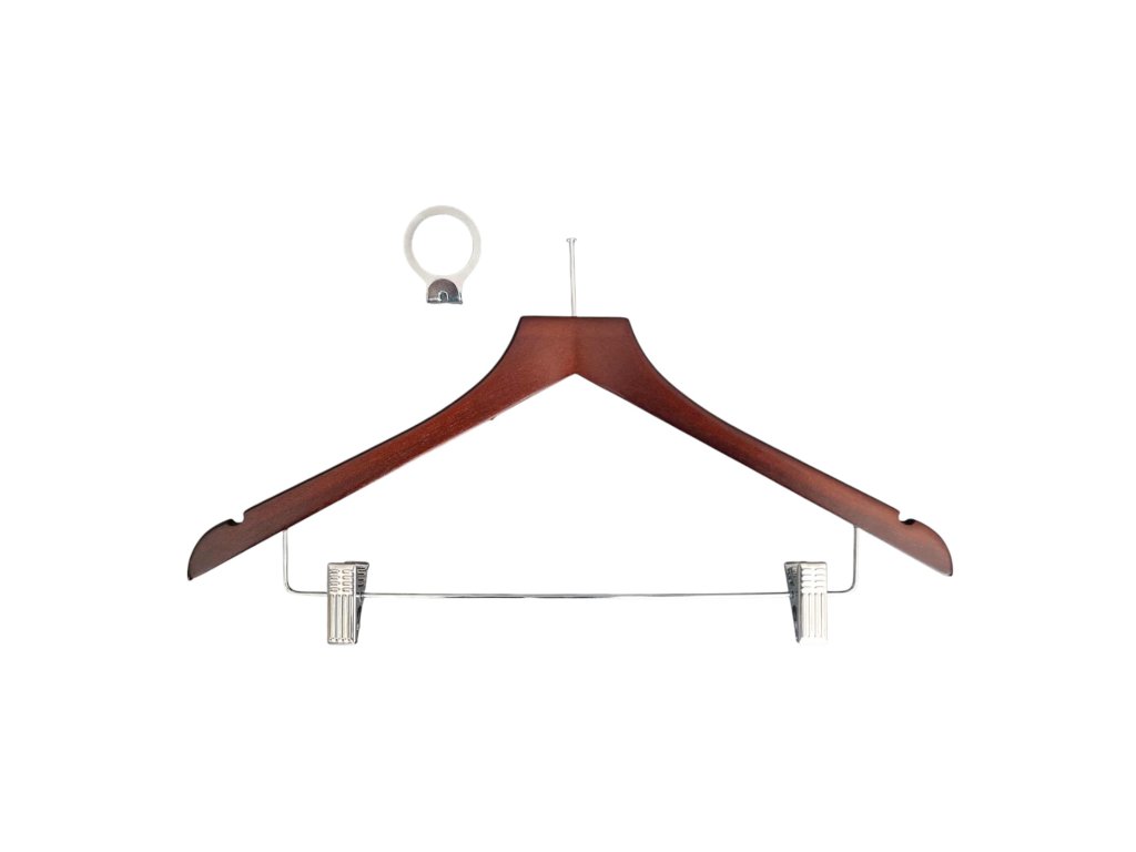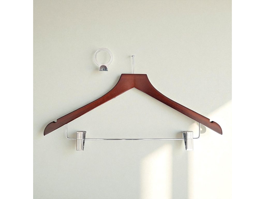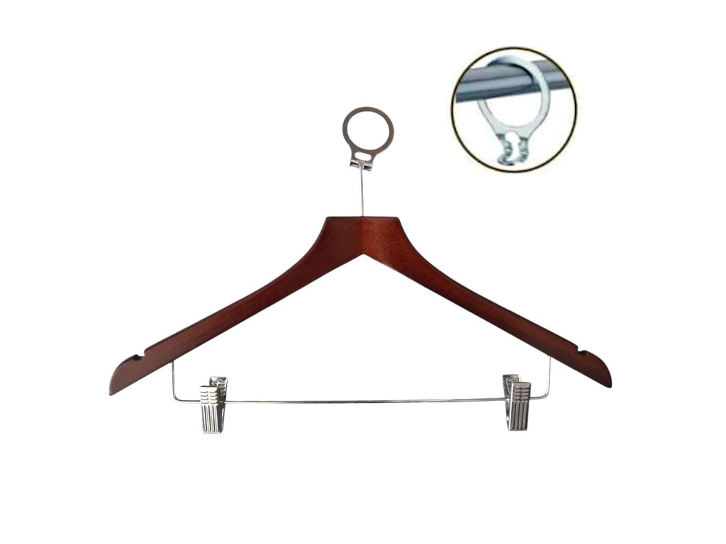 Gruccia in legno con anello antifurto e clip per pantaloni