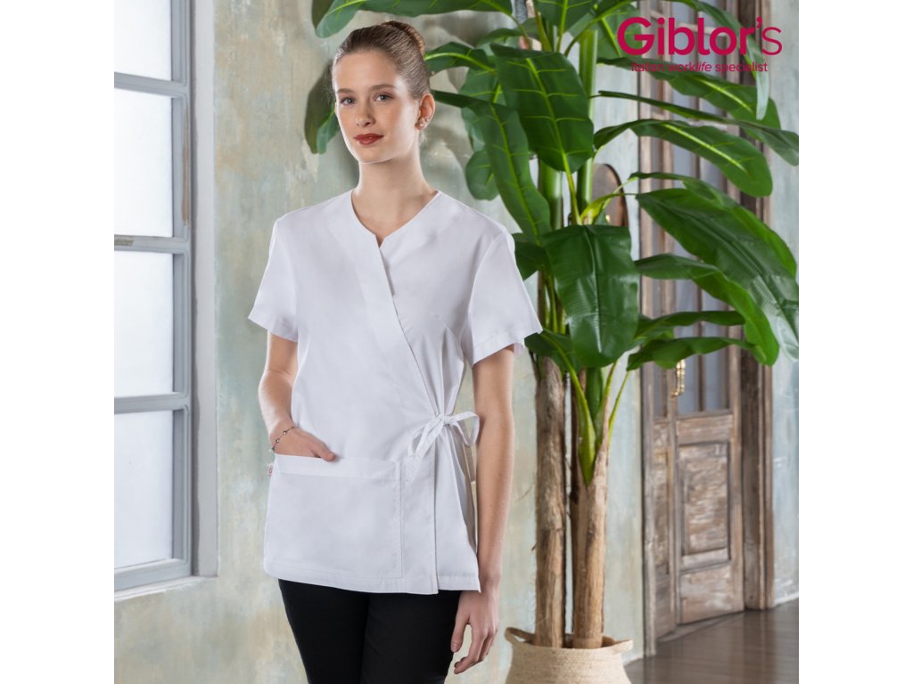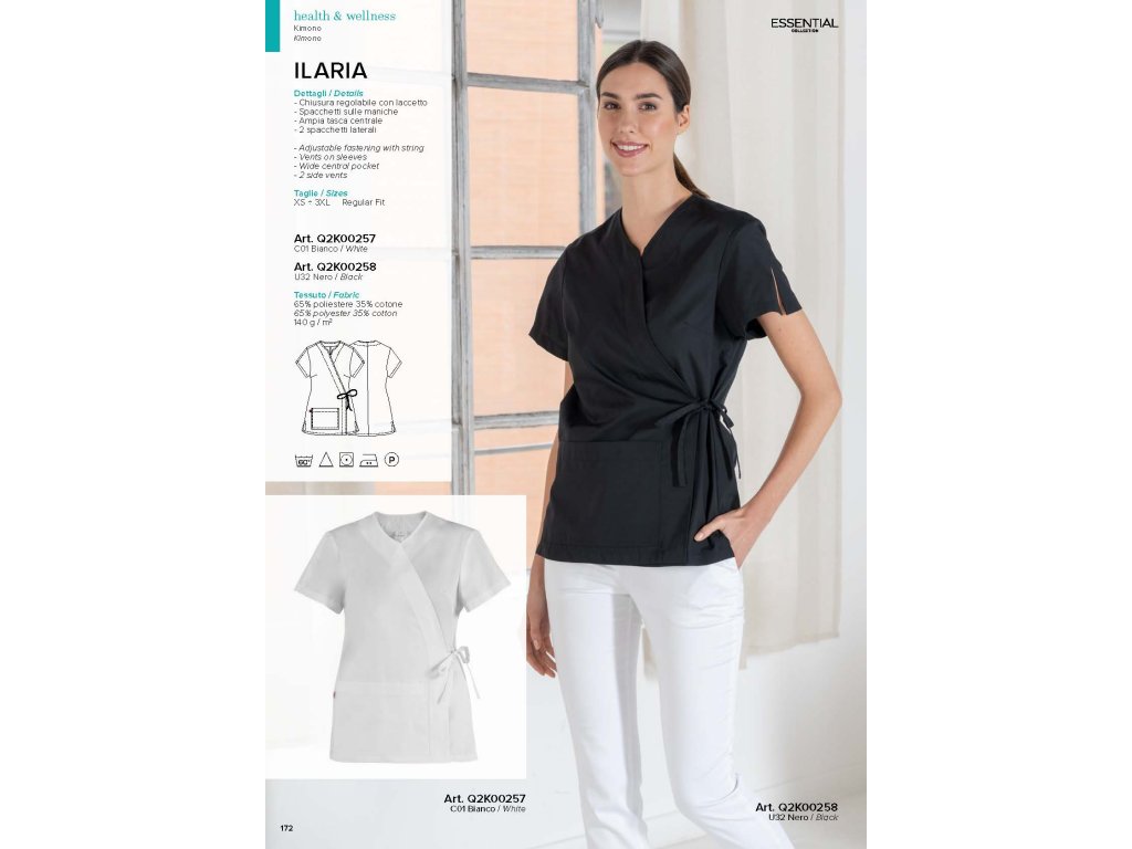 Il kimono da donna Ilaria è un capo semplice, naturale e fresco, ideale per il settore benessere, dallo stile molto femminile, sottolineato da una chiusura incrociata con coulisse per annodare in vita. Presenta maniche corte con spacchi per facilitare i movimenti, un'ampia tasca sul davanti e spacchi sui fianchi.