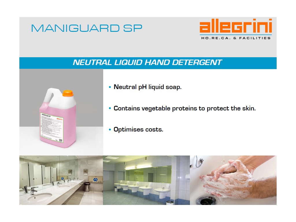 MANIGUARD SP è un detergente liquido per le mani a pH neutro con tensioattivi di alta qualità, molto delicati sulla pelle.