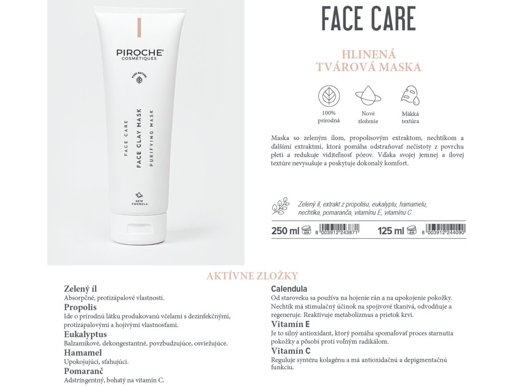 Ingredienti principali: Argilla verde, estratto di propoli, eucalipto, amamelide, calendula, arancia, vitamina E, vitamina C.