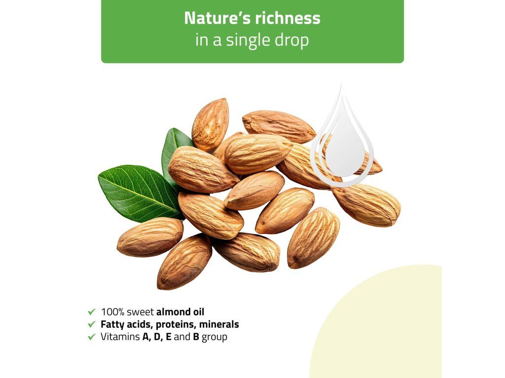 Olio 100% naturale di mandorle dolci, ricco di acidi grassi, proteine, minerali e vitamine B, A, D ed E. Composizione completamente vegana, senza additivi né conservanti – ideale per massaggi del viso e rituali SPA domestici.