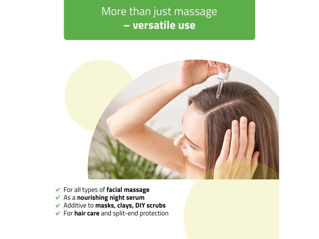 Molto delicato, naturale e neutro – non sovrasta, non irrita e non interferisce con altri cosmetici. Un aroma vegetale puro e leggero, ideale per massaggi del viso e rituali di skincare. Per un profumo più intenso è possibile aggiungere il proprio olio essenziale preferito.