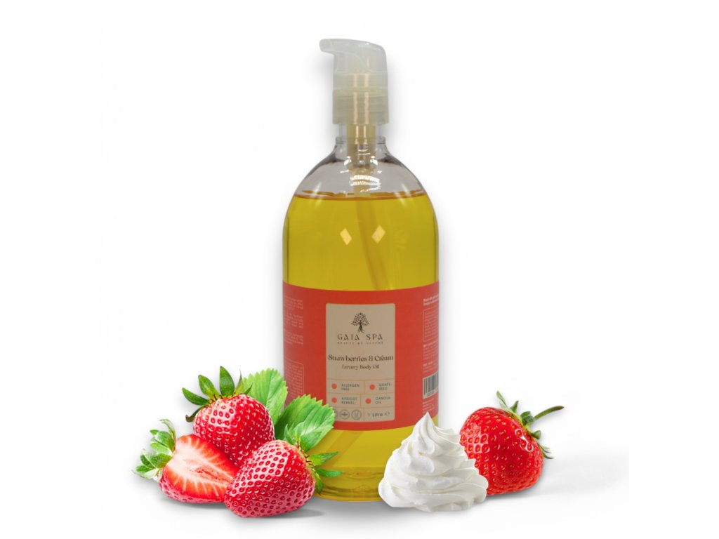 Olio per massaggio corpo Fragole e Panna - GAIA SPA. Regala alla tua pelle i lussuosi benefici dell'Olio Corpo Fragole e Panna, una miscela nutriente studiata per idratare e ringiovanire in profondità. Questo olio corpo arricchito con oli ricchi lascia la pelle morbida, liscia e profondamente nutrita. Ideale per un'esperienza rivitalizzante con una cura della pelle dal profumo dolce e senza allergeni.