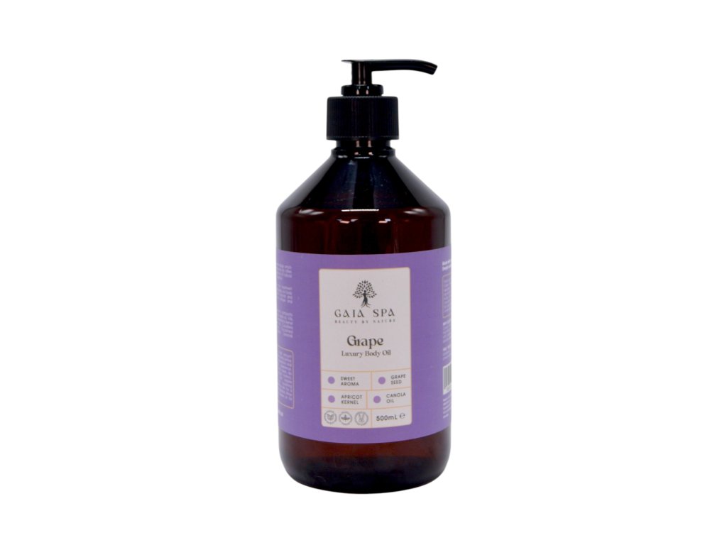 Olio per massaggio corpo Uva (Grape) - GAIA SPA. Regala alla tua pelle i lussuosi benefici dell'olio corpo all'uva, una miscela nutriente studiata per idratare e ringiovanire in profondità. Questo olio corpo lascia la pelle morbida, liscia e profondamente nutrita. Ideale per un'esperienza di cura della pelle rivitalizzante con il profumo rinfrescante dell'uva. Aiuta ad alleviare la tensione muscolare dopo lo sforzo fisico, migliorando le condizioni generali della pelle.