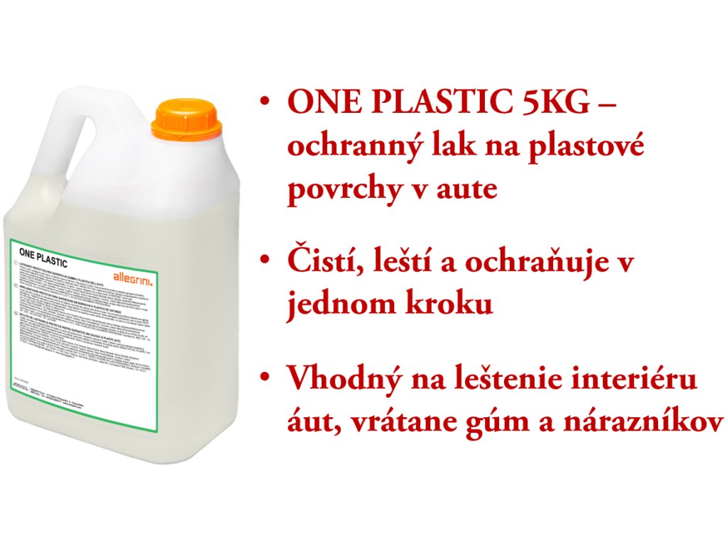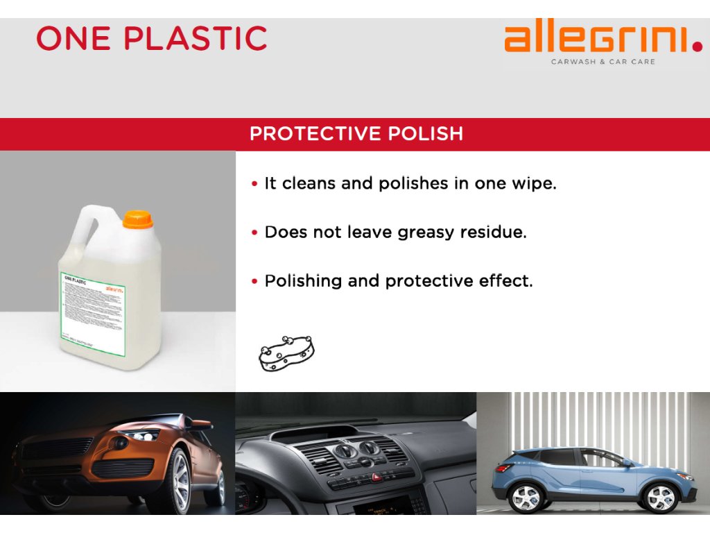 ONE PLASTIC è una vernice protettiva per cruscotti di automobili. In un solo passaggio, pulisce, lucida e protegge le superfici in vinile, pelle, plastica, gomma, acrilico e legno. Lascia la superficie piacevolmente profumata. Ideale per interni auto, piani di lavoro, paraurti esterni, pneumatici.