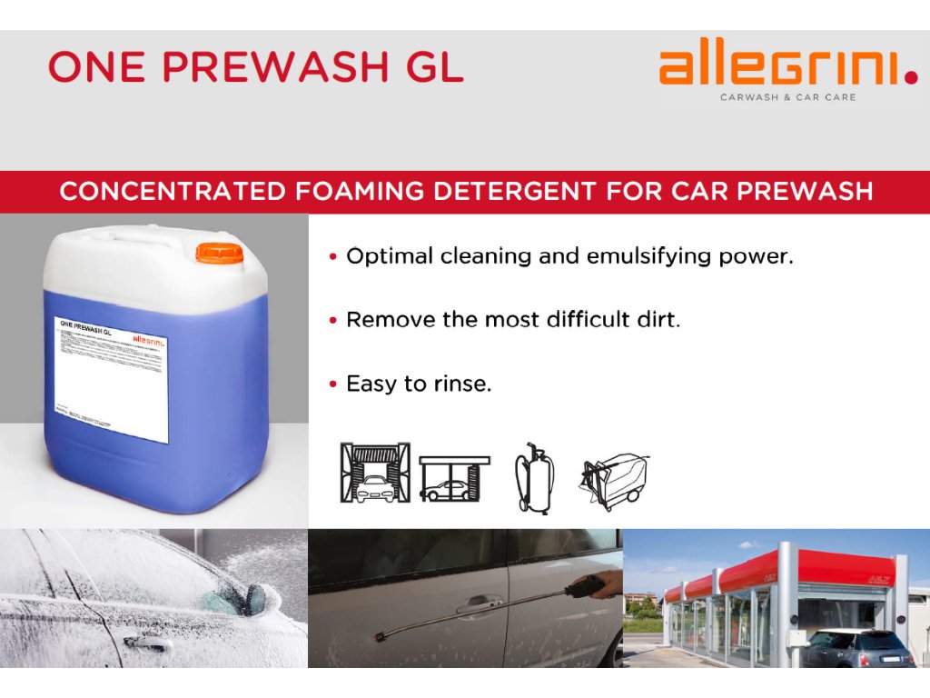 Basato su tensioattivi selezionati di alta qualità, ONE PREWASH GL offre un eccellente effetto emulsionante sullo sporco ostinato, inclusi grasso, depositi, smog e patine da traffico. Se utilizzato con un dispositivo schiumogeno, crea una schiuma altamente sgrassante, è facile da risciacquare e prepara in modo ottimale l'auto al lavaggio successivo. È delicato sulla carrozzeria. Solitamente, i detergenti di questa categoria rilasciano odori pungenti durante la fase di nebulizzazione. Al contrario, ONE PREWASH GL, grazie alla sua specifica formulazione, limita questo effetto. Ideale per il lavaggio professionale di teloni, cerchioni e ruote.