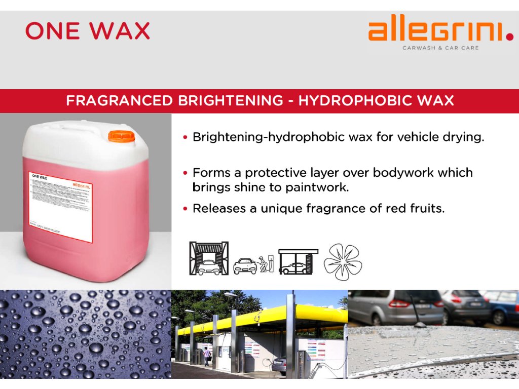 ONE WAX è un'innovativa cera brillantante-idrofobica per l'asciugatura dei veicoli dopo la fase di lavaggio nei sistemi di asciugatura automatica.