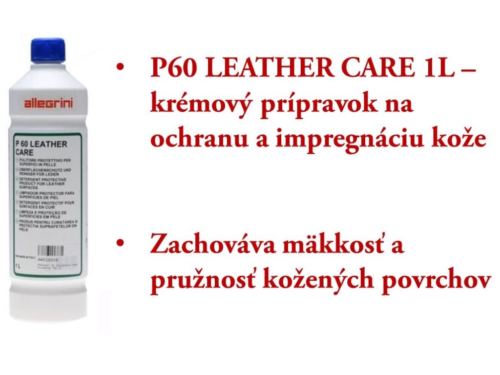 PUSO: Come la nostra pelle, le superfici in pelle possono invecchiare prematuramente se non adeguatamente curate, perdendo la loro morbidezza, flessibilità e aspetto originali. Per prevenire l'invecchiamento, è necessario pulire, nutrire e proteggere regolarmente i rivestimenti in pelle degli interni dei veicoli. P60 LEATHER CARE è un detergente cremoso appositamente sviluppato dai laboratori ALLEGRINI per pulire e proteggere le superfici in pelle. Grazie alla sua innovativa formula con olio di avocado, P60 LEATHER CARE: Ristruttura la pelle e ne ripristina la naturale bellezza, preservandone la morbidezza e l'elasticità, contribuendo a prevenire la formazione di screpolature; impedisce alla polvere di seccarsi, facilitandone la successiva pulizia. Garantisce una protezione duratura della pelle, aumentandone la naturale idrorepellenza.