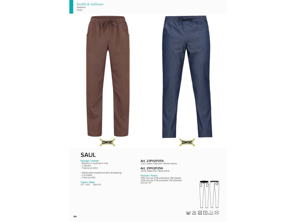 I pantaloni Saul ricordano il modello Alan con una linea più asciutta e un taglio unisex. La nuova versatile variante in jeans è realizzata in morbida poliviscosa dalla mano morbida che non aderisce al corpo. La vita è fasciata da un elastico alto 4 cm e da una coulisse, mentre il capo è completato da due tasche laterali e un taschino posteriore. Grazie al suo stile versatile, si adatta ad ambienti come spa e studi medici, ma anche ad ambienti di cucina moderni e urbani o ad ambienti street food.