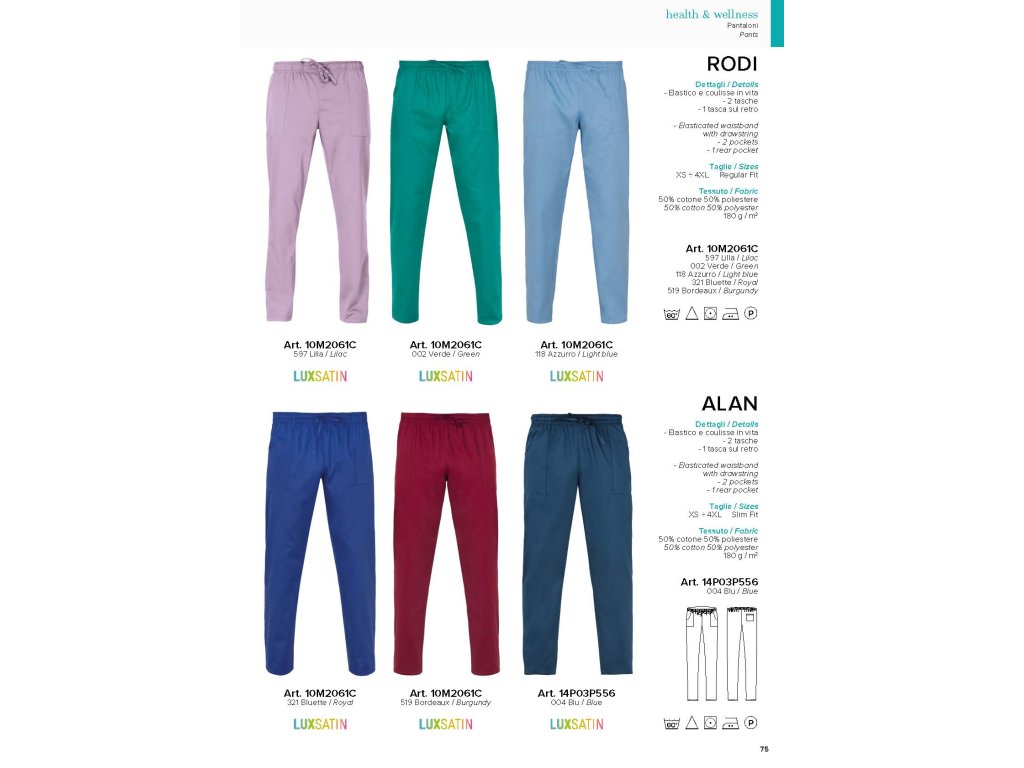Pantaloni RODI. Pantaloni unisex dalla vestibilità regolare e dal taglio trendy, con coulisse, due tasche laterali e una piccola tasca posteriore. Realizzati in pregiato cotone poliestere da 180 grammi, resistenti alle alte temperature e al candeggio, facili da lavare e da stirare.
