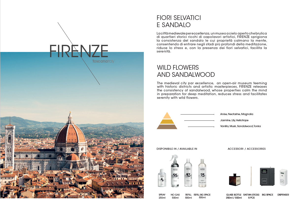 FIRENZE, dedicata a Firenze, città a cielo aperto dove ogni quartiere è ricco di celebri opere d'arte, ha un carattere elegante e nobile. L'essenza di sandalo, dagli effetti calmanti e utilizzata nella meditazione, si unisce al profumo di fiori di campo, che allevia lo stress e dona fiducia in se stessi.